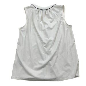 A lightweight sleeveless blouse featuring a sleek black trim detail along the collar and front placket. Ideal for work or casual settings.