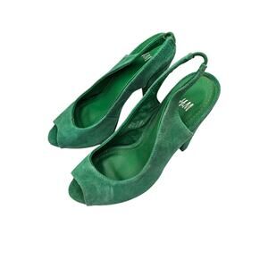The product is a pair of women's size 6 platform high heels from H&M. Made of faux suede in an emerald green color, these slingback heels feature a stylish design that is perfect for adding a pop of color to any outfit. The platform sole provides extra height while the slingback style offers a comfortable and secure fit. Perfect for a night out or special occasion, these high heels are a statement piece that is sure to turn heads.