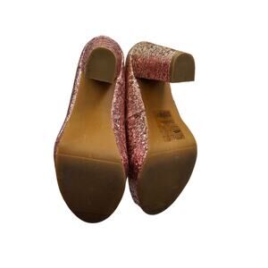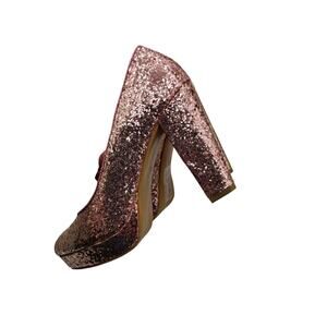 The product is a pair of H&M women's size 6 platform shoes with a round toe and high heel, featuring a pink and gold ombre glitter design. These glamorous heels are perfect for adding a touch of sparkle to any outfit. The platform style provides extra height while the glitter finish adds a touch of glamour, making them ideal for special occasions or nights out.