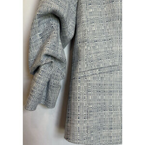 Features a textured tweed blue blazer with one hook front, inner lining, ¾ rouched sleeves, faux pockets