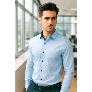 This smart-casual oxford shirt adds a fresh spin to classic menswear with its sleek light blue hue and unexpected black contrast lining at the collar and cuffs. Designed in a contemporary slim fit, it moves easily from laid-back workdays to casual weekend plans. Wear it buttoned up for a clean-cut look or roll the sleeves to reveal the subtle pattern accents underneath. The soft cotton blend offers breathable comfort while maintaining polished structure. Whether styled with dark jeans or tailored pants, it fits into minimal, soft classic, and normcore wardrobes with effortless ease.