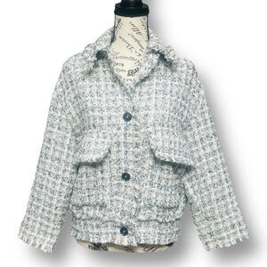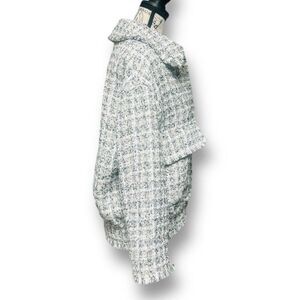 This chic H&M tweed jacket features a black and white bouclé texture with cropped tailoring, full front buttons, and a touch of fringe, perfect for a Parisian-inspired layered look.