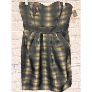 H&M Y2K Strapless Plaid Mini Dress w/Pleats and Pockets Black Tan Blue SZ 8 NWOT