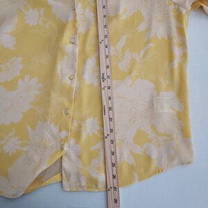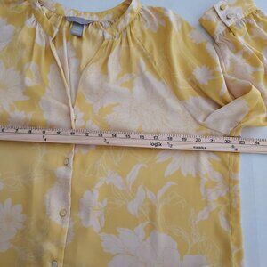 Chic yellow blouse with floral pattern. Button-down front. Long sleeves with cuffs.