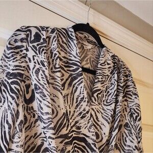 Stylish zebra print blouse. Features a wrap design. Long sleeves. Perfect for any occasion.