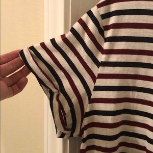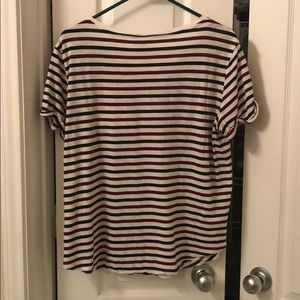 white shirt with dark blue and red stripes, fake pocket in front. no stains, in decent condition!
