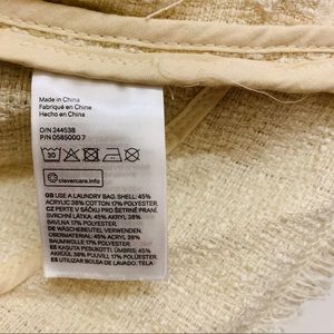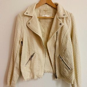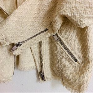 NWOT. Weave texture. Diagonal zip. Zipper pockets. Zipper cuffs. Frayed cuffs and hem. with zip, and zip at cuffs. Lined. Cream color.