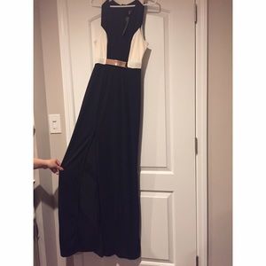 This is an H&M long stretchable dress with a slit at the front right side. Plunged v neck. This dress also comes with a gold plated belt. New with tags. Never been worn