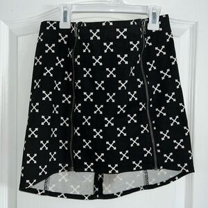 New with tags, never worn. H&M black & white tribal mini skirt in size 10 and very stretchy. Has an X pattern and two zippers running down the front.