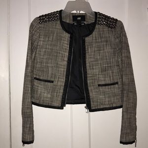 H&M blazer. Size 6. In like new condition, no signs of wear. Working silver metal zipper closure with zipper on each sleeve. 2 functional pockets. Cotton & polyester blend. Navy blue satin lining & piping throughout. Comes from a pet free, smoke free home. Make an offer!