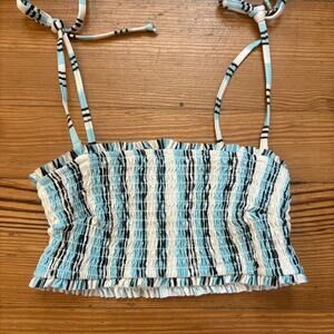 H&M blue black white striped smocked tie top bikini swimsuit SIZE M