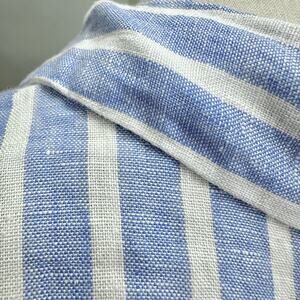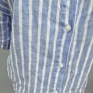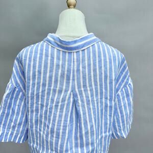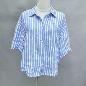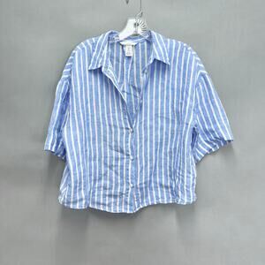 H&M blue striped linen 3/4 sleeve button up cropped top size Small boxy oversize