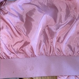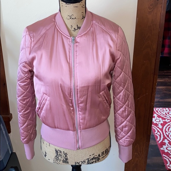 Pink satin bomber jacket from H&M, it has very minor staining on the inside but nothing that could be noticed if wearing it. It says it’s a size ten but it does have a very tight fit so I’d say nothing more than an xs would fit.