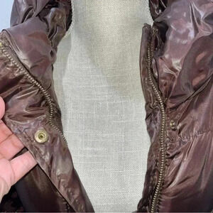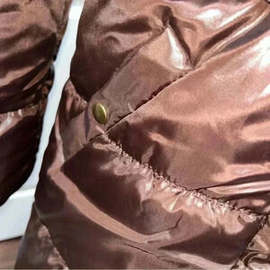 Description: great long brown puffer, with waist pockets and an elastic attached waist belt. High neck, zip and button closures