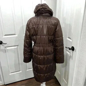 Description: great long brown puffer, with waist pockets and an elastic attached waist belt. High neck, zip and button closures