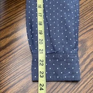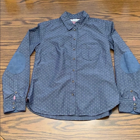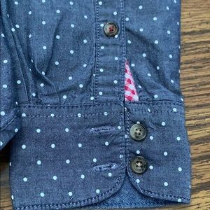 Blue denim look with white dots. Red/white gingham check at hemline in corner and at wrist (shown in pic) Elbow patches. Like new condition.