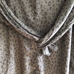 Gray with leopard pattern. Collared button down shirt with cotton sleeves. All buttons in tact. Extra button on inside tag.