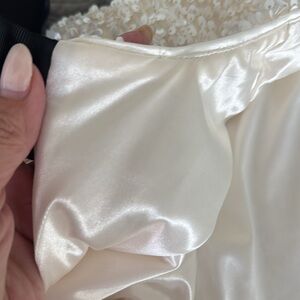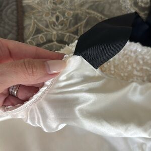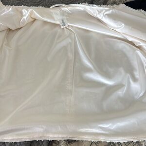 Worn 1 time. There looks like there is a tiny bit of makeup on the top on the inside/seam. Please see pictures