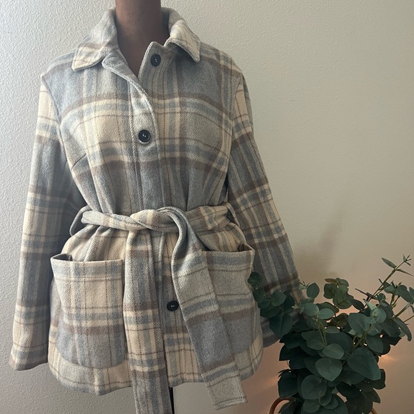 H&M coat. I’m a great used condition. Has two pockets in the front and tie belt. Size small. Length is 26”