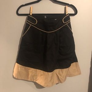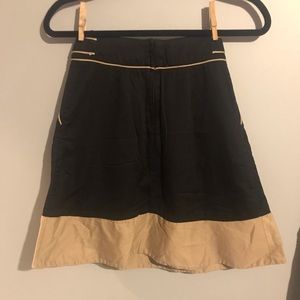 This skirt has a zipper in the back. It also has pockets. It does have signs of wear but is in good condition.