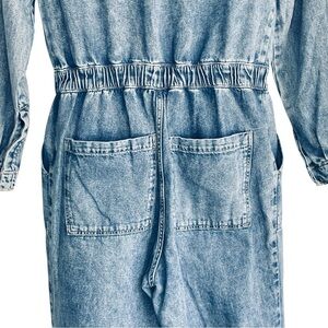 H&M | One Piece Long Sleeved Denim Jumpsuit Long sleeved denim jean jumpsuit. Slightly acid wash. Reminds me of the Free People denim jumpsuit. Zips down the front. Front pockets. Elastic waist to give you some shape. Size 4. Feel free to make me an offer! Bundle and save.