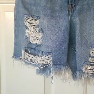 Comfy pair of distressed jeans shorts.8" rise, 7" inseam, 13.5" waist