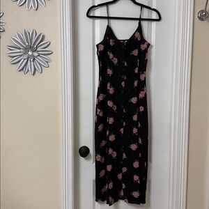 This item does have a very faint stain in the front mid section it is really small and you can't really tell. Looks more faint in person it could come off in the wash probably. Measurements are shoulder down about 47 inches and armpit to armpit is about 17 inches. It also has two slits in the front. The material doesn't stretch. The straps on this dress are adjustable.