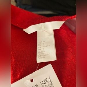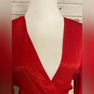 Red w/ animal print pattern; V-neck; long sleeves w/ single button cuffs; faux surplice wrap; straight hem 100% viscose Bust - 40” Shoulders - 15” Sleeves - 24” Waist - 35” Length - 47”