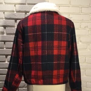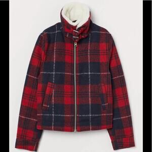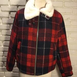 New without tags. Lightly padded jacket in felted fabric with quilted lining. Faux fur collar with adjustable tabs and metal buckles, zip at front, and side pockets. Tagged large.