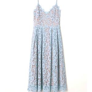 Calf-length lace dress with a V-neck and narrow, adjustable shoulder straps. Seam and concealed zip at the waist, and a flared skirt