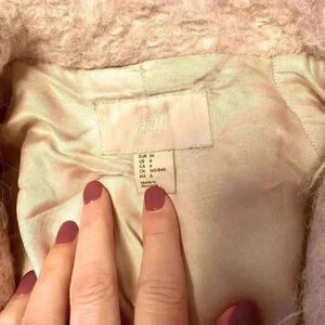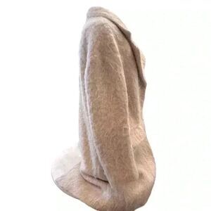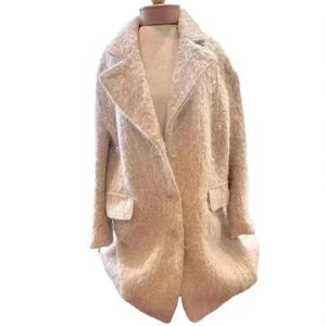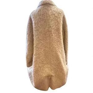 Knee-length, double-breasted coat is a wool, mohair polyester blend. Wide notched lapels, buttons at front, long raglan sleeves, and flapped side-pockets, vent at back & fully lined.