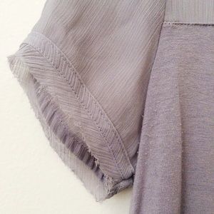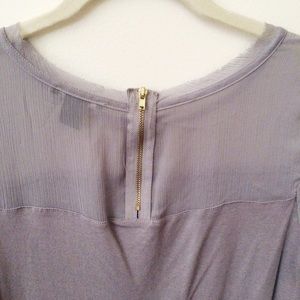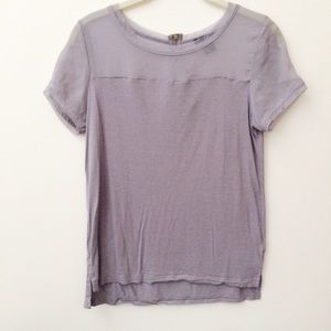 Gray short sleeve top. Slightly longer in back. Gold tone zipper in back. Sheer on top, with unfinished neck and arm openings. Rest of the top is a soft t-shirt material. Light piling under arms (not noticeable when worn). Size Small.
