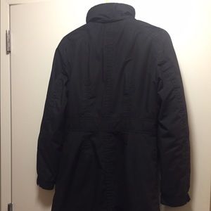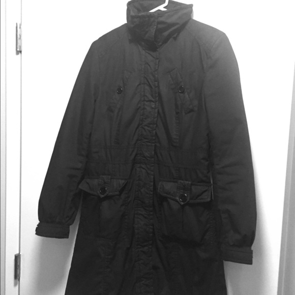 Perfect for fall or spring, this h&m jacket is cotton, without the hood. I haven't worn it in years. Falls right below the knee. Used, but good condition. Flaws: small tear near zipper inside (3rd pic) and a broken button on the sleeve. Trying to make room in my closet! :-)