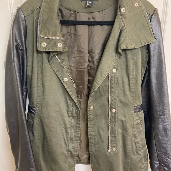 H&M jacket. Leather sleeves, army green. Comfy. Gently used