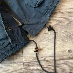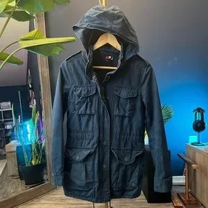 Navy blue jacket/coat with hood that can be tucked into a zippered pocket