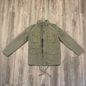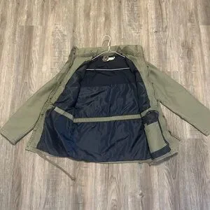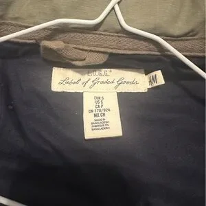 Size small fits like a medium. Navy blue inside but you can’t really tell. Multiple strings to customize fit including inside the jacket by the hips. Hoodie folded inside the collar zipper. I personally liked it inside the collar while wearing another hoodie.
