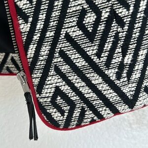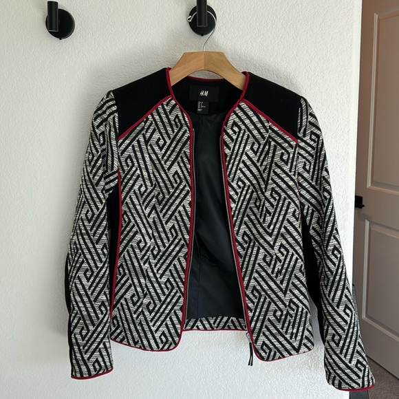 Collar-less zip up with leather details / textured / red piping / size 2 or XS/S