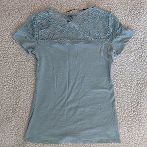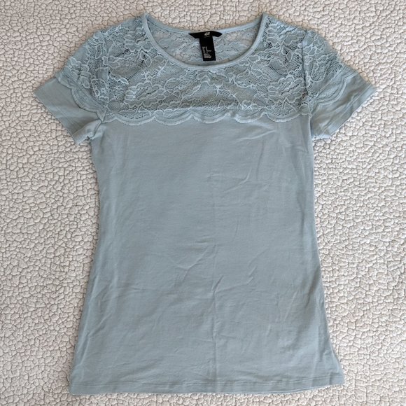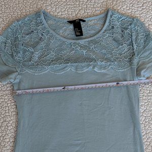 Soft light blue tee with an upper sheer lace detail. The material has some stretch but it's definitely a tighter fit for size M.