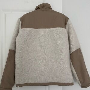 Stay warm and stylish with this beige and cream sherpa jacket. Perfect for chilly days, this jacket offers comfort and a trendy look.