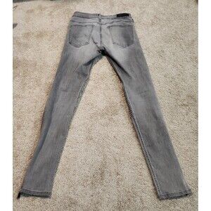 These H&M jeans are gray in color and have a slight stretch to them. They feature intricate detailing, including texture differences and zippers. The jeans are in excellent condition, with only one small spot near the ankle (as shown in the reference picture). The inseam measures 28 inches, the rise is 8 inches, and the waist is 27 inches.