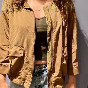 Lightly pre-worn olive green short-sleeve shirt/jacket with front pockets from H&M, 100% polyester, US size 10!