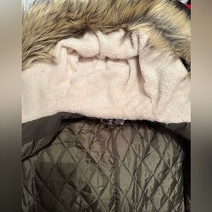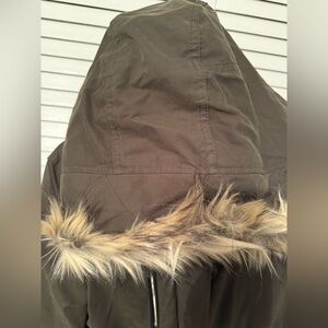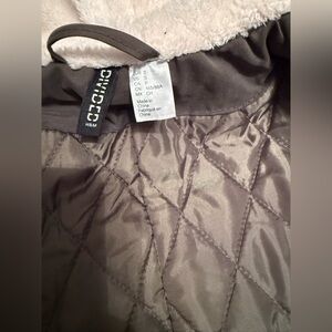 H&M utility jacket, not super heavy, green color, size small, hood can't be removed, faux leather black trim - worn less than 5 times. Material info in the pics.