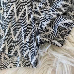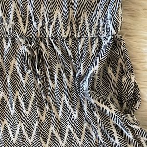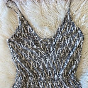 H&M v-neck patterned romper with cami straps and drawstring waist. V-back and side pockets. Super soft viscose. Some stretch. Inseam approximately 2”. Relaxed fit. Ladies’ size small. Gently worn, looks great. White/cream and black.