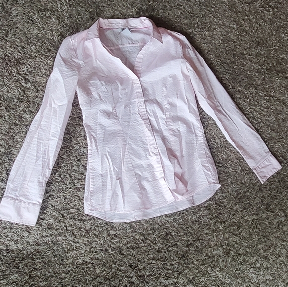 Lightly stripped pink button down from H&M. V-neck, low first button. Fitted-size US12. Good condition.