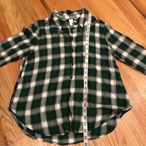 Add a touch of whimsy to your wardrobe with this H&M plaid flannel! The soft green fabric is perfect for layering, and the playful spider sequins on the neckline add a unique and eye-catching detail. This gently used flannel is in excellent condition and ready for a new home.
