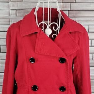 Cotton spandex blend Juniors red canvas double breasted jacket with a notched collar to a versatile foldover collar, fitted with a straight hemline, and two hand pockets. Great pre-owned condition. This is probably equivalent to an adult medium. Check measurements
