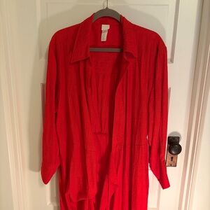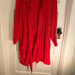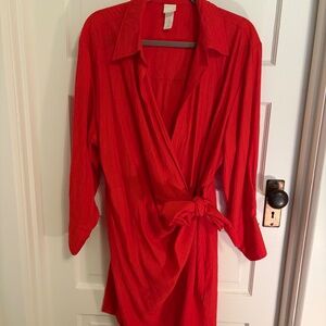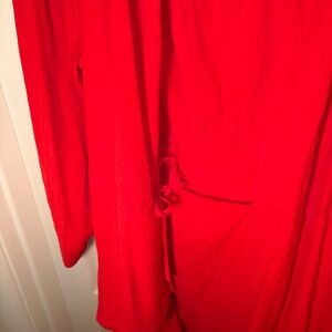Medium red wrap around, super low neckline red dress that looks great over a tight body suit. Very festive, great for parties and holidays. 83% viscose, 17% polyamide.