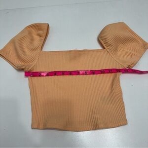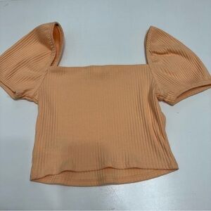 Fitted crop top in ribbed jersey. Square neckline, covered elastic over shoulders, and short puff sleeves with covered elastic at cuffs.