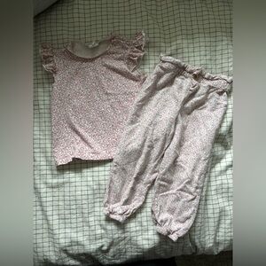 This was given to us as a set, but the bottoms are a 2T and top is 12-18m with different fabrics. The shirt is cotton and bottoms are viscose, which is why the shirt is more vibrant. The pants have an inner waistband adjuster.