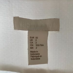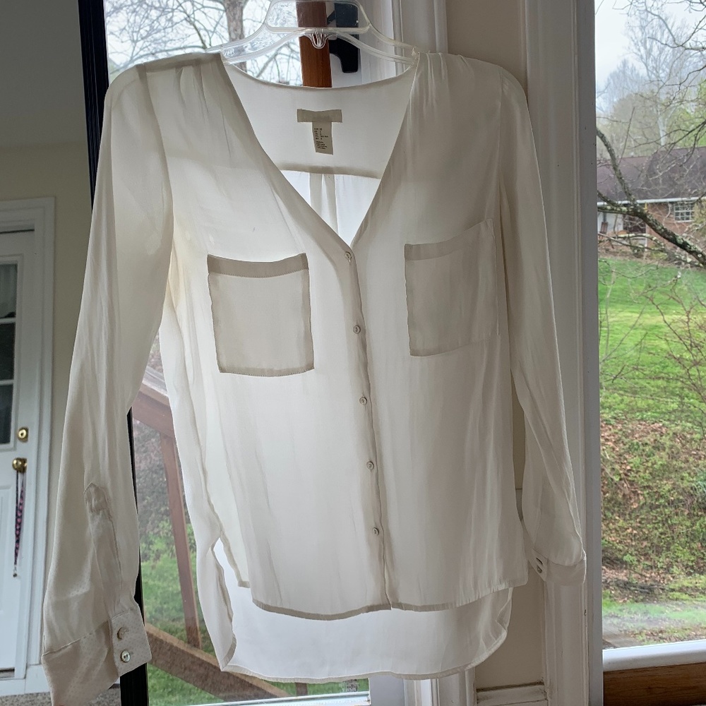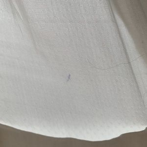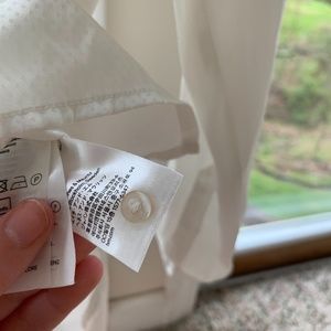 high quality material, somewhat see through, comes with an extra button, has a small stain above pocket that is pictured; fits like a 0-2